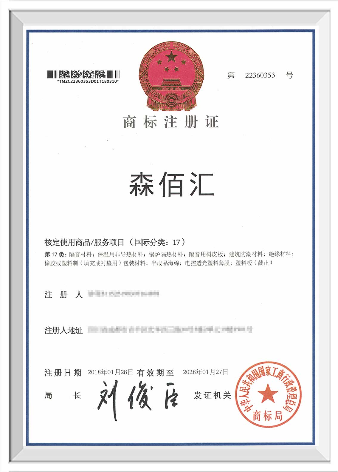 宿州“森佰汇”商标证书下发至企业